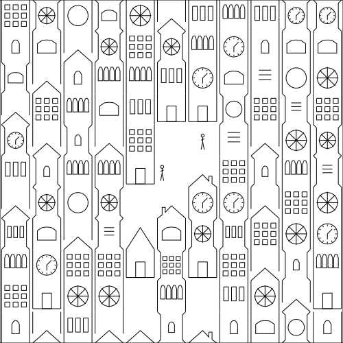 Although the pattern is a static one. Because this NFT version is dynamically rendered in the web-browser, we can play with some other variation. In particular the city clocks now show the current time. And the position and density of the people varies slightly with the time of day.